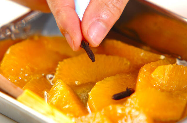 バットにオレンジを入れてハチミツをからめ、クローブ、シナモンスティックも入れる。ラップをぴったりとし、冷蔵庫で20~30分冷やす。