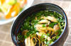 鍋にだし汁を入れて強火にかけ、煮立ったら<調味料>、シメジを加える。