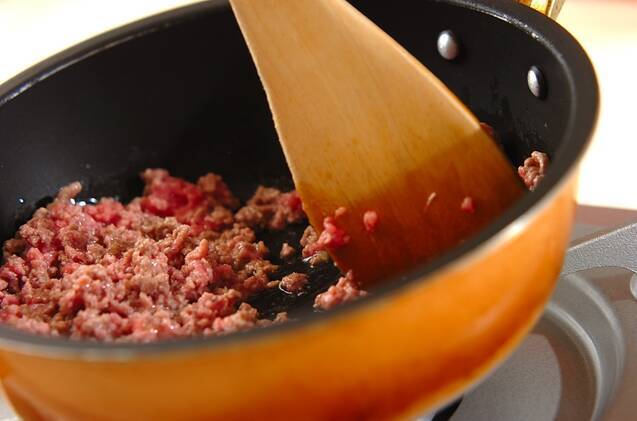 フライパンにゴマ油とショウガを中火で熱し、合いびき肉を加えて火を少し強め、ポロポロになるまで炒める。