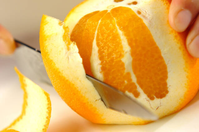 オレンジは薄皮ごと包丁で皮をむき、1房ずつ取り出す。
