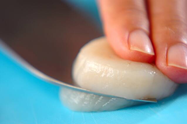 ホタテの貝柱は厚さを半分に切る。ルッコラは長さ3cmに切る。