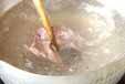 鶏レバーは熱湯にサッとくぐらせ、ひと口大に切る。