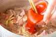 鍋に酒、水を入れて強火にかけ、煮立てばレバー、砂肝、ショウガを加える。