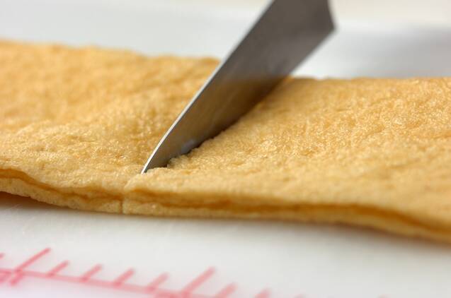 油揚げは熱湯でゆでて油抜きをし、水気をしっかりきって粗熱を取り、半分に切る。