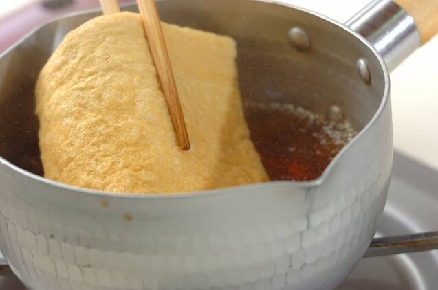 鍋に<調味料>の材料を入れてひと煮たちさせ、油揚げを加えて落とし蓋をし、弱めの中火で煮汁がなくなるまで煮る。