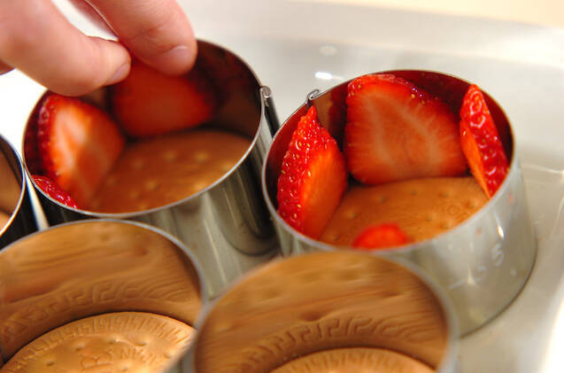 イチゴはヘタを切り落として縦にスライスし、底にビスケットを敷いたセルクルの側面に貼り付けておく。