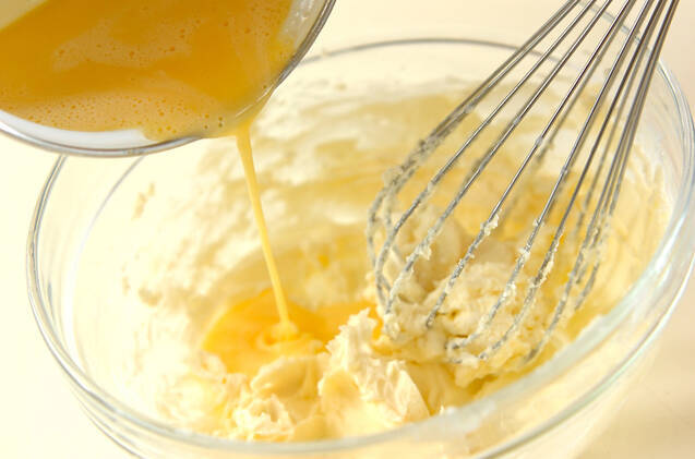 (1)に少しずつ加えて混ぜ合わせ、網でこしたら氷水にあてて粗熱を取る。
