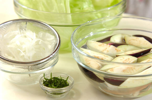 ナスはヘタを切り落として縦4つに切り、さらに斜め半分に切ってたっぷりの水に放つ。