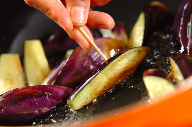 フライパンにサラダ油を中火で熱し、ナスを並べ入れ、菜ばしで返しながら火を通す。油が少なくなったら途中で分量外のサラダ油を足す。ナスに竹串がスッと刺さったら取り出し、油をきって<タレ>のボウルに加えて和え、食べる直前まで冷蔵庫で冷やす。(ヒント)調理時間に冷やす時間は含みません。
