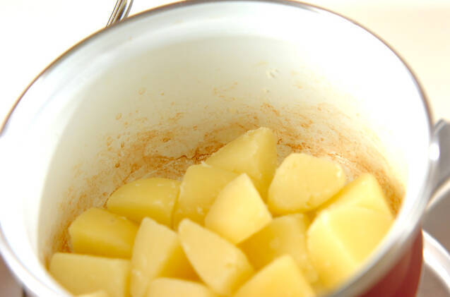 ゆで上がったら、ゆで汁を捨てて強めの弱火にかけ、ジャガイモを転がすように鍋を振り、水分を飛ばす。