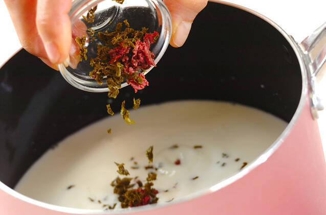 鍋に牛乳、桜の花の塩漬け、桜の葉の塩漬けを入れ、弱火にかける。(ヒント)牛乳を沸騰させないように、火は必ず弱火で!