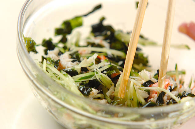 ボウルに<合わせ酢>の材料を合わせ、カニ、キュウリ、ワカメを混ぜ合わせて器に盛り、針ショウガをのせる。
