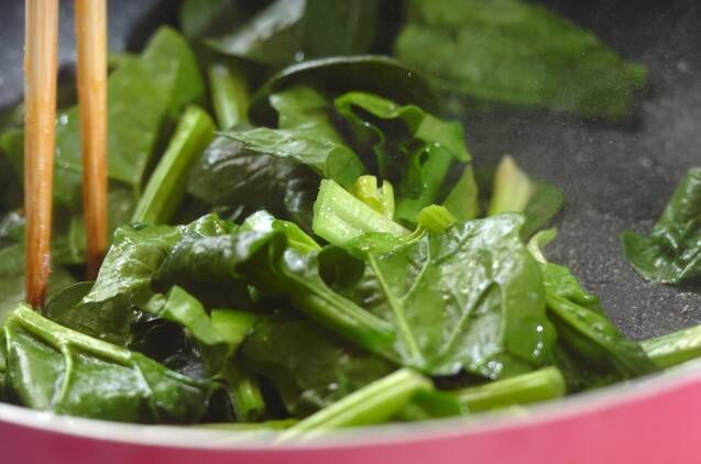 フライパンにバターを中火で熱し、バターが溶けたら水気をしっかりきったホウレン草を加え、炒める。