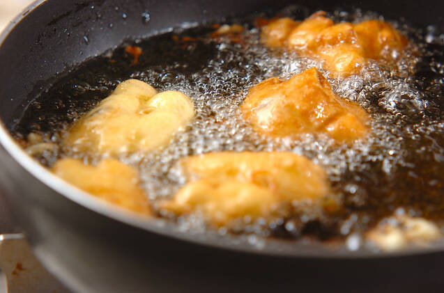 揚げ油に1をひとくち大ずつ落とし入れて、表面が美味しそうなキツネ色になるまで揚げ、油を切る。半量は<合わせシナモン>に、残り半分はきな粉を絡めて器に盛る。