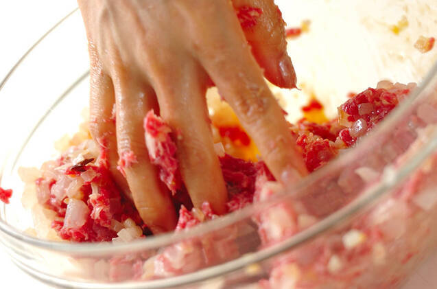 新玉ネギはみじん切りにし、フライパンにサラダ油を中火で熱し、しんなりするまで炒め、バットにあけて粗熱を取る。冷めたら他の<メンチカツダネ>の材料と混ぜ合わせ、塩コショウを振りよく混ぜ合わせる。