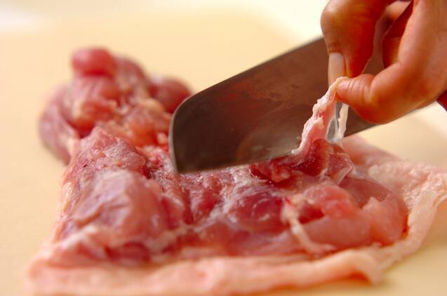 鶏もも肉は大きな脂と太い筋を取り除き、ひとくち大に切り、塩をもみ込む。