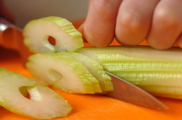 セロリは筋を引き、斜め薄切りにする。ボウルで<マリネ液>の材料を混ぜ合わせる。