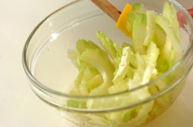 <マリネ液>のボウルにセロリを入れて混ぜ合わせ、冷蔵庫で冷やし、器に盛る。