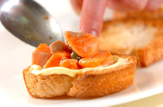 バゲットにマヨネーズをぬって合わせたサーモンをのせ、レモンと生ディルをのせる。合わせたトマトとカッテージチーズものせ、お好みで粗びき黒コショウをかけて、盛り合わせる。