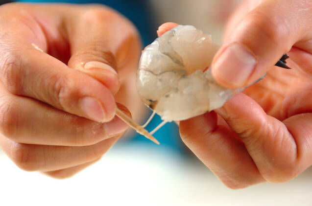 エビは殻と背ワタを取り除き、分量外の塩水で水洗いし、水気をきって塩をもみ込む。