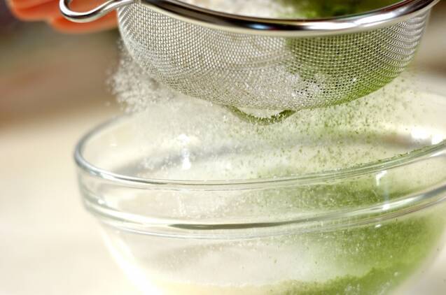 薄力粉と抹茶は合わせて振るっておく。パウンド型に型紙を敷き込んでおく。