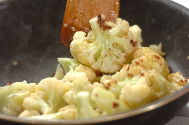 フライパンにオリーブ油、ニンニク、アンチョビを弱火で熱し、香りがたったらカリフラワーを入れ、焼き色がつくまでじっくり炒める。