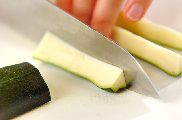 ズッキーニは縦8等のくし切りにし、オリーブ油をからめる。