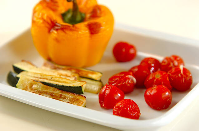 オーブンシートをしいた天板にプチトマト、黄パプリカ、ズッキーニを置き、200℃に予熱しておいたオーブンで20~30分焼く。黄パプリカはヘタと種を取り、細切りにする。(ヒント)様子を見ながら焼けた物から取り出して下さい。