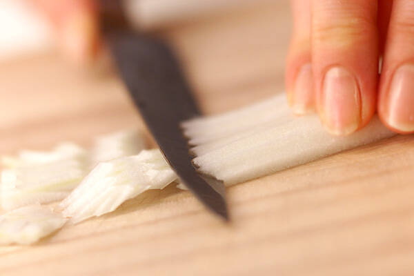 白菜は縦2~4分に切り、1.5cm幅に切る。(軸は火が通りやすいように斜め削ぎ切りにする)ジャガイモは皮をむいて一口大に切り、水に10分位さらす。ニンジンは皮をむき、一口大の乱切りにする。水煮マッシュルームはザルに上げて汁気を切る。(ホールの場合は薄切りにする)