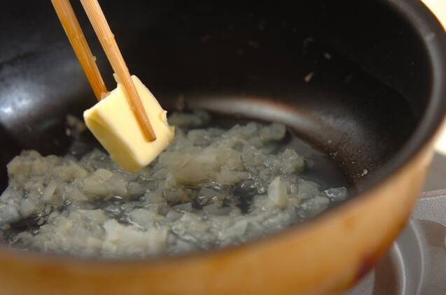 蒸し汁を半量になるまで煮詰め、バターを加えて溶かす。器に盛ったアサリにドライパセリを振り、蒸し汁を全体にかける。