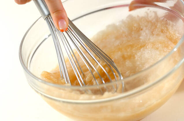 長芋の入ったボウルに<合わせだし>を少しずつ加え、混ぜ合わせる。
