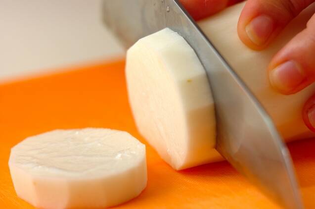 長芋は皮をむき、厚さ1cmの輪切りにする。