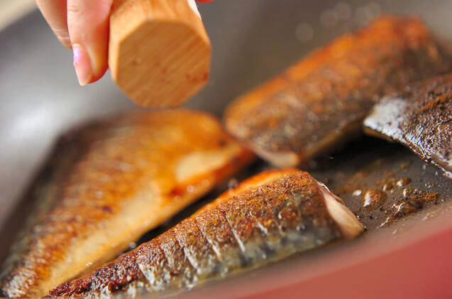 黒七味と黒ゴマを塩サバ全体に振って器に盛り、スダチ、甘酢ショウガを添える。