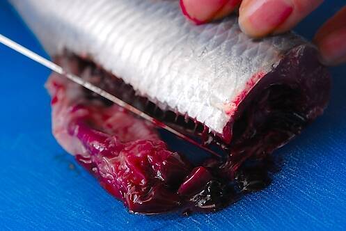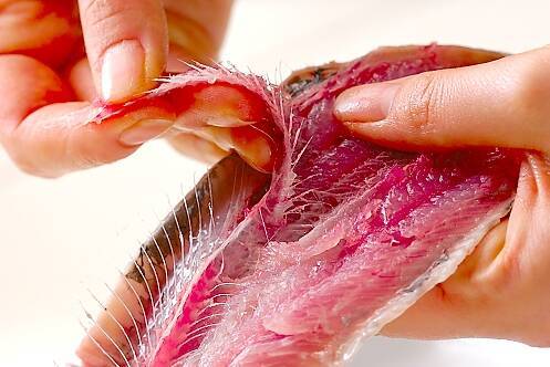 イワシは指先で尾から頭に向かってウロコを取り、手開きにして中骨を取る。<イワシの手開き>頭を落とし、腹を斜めに切る。ワタを出して塩水で洗う。親指の腹を中骨に添わせ頭側から尾に向かって滑らせるように身をはがし、尾の付け根で骨を折り、身を押さえながら骨を頭に向かってはがすように取る。腹側に小骨がある場合は削ぎ落とす。