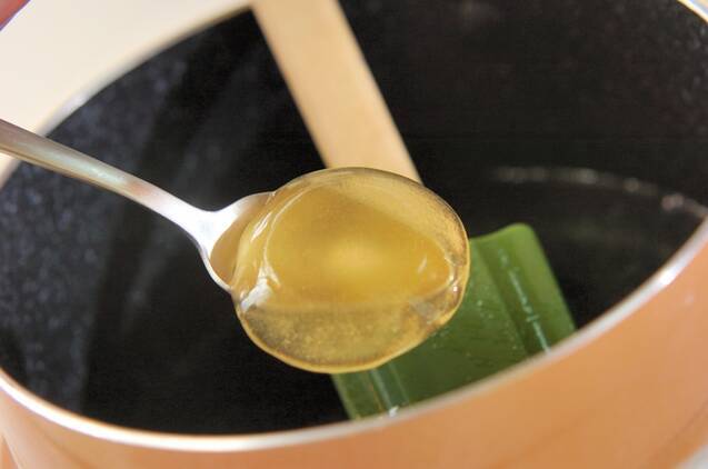 鍋底を水につけて、準備した粉ゼラチンを加える。粉ゼラチンを混ぜ溶かして、粗熱が取れたらバットに流し入れる。