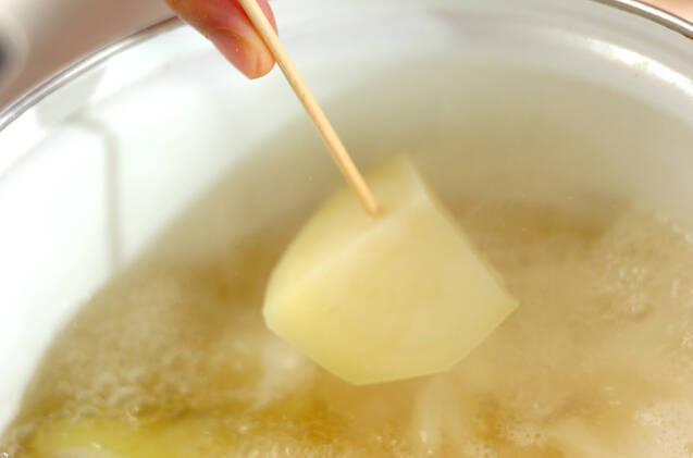 鍋にだし汁、ジャガイモ、玉ネギを入れて中火にかけ、玉ネギが透き通ってきたら、ジャガイモを竹串で刺して柔らかくなっているのを確認する。