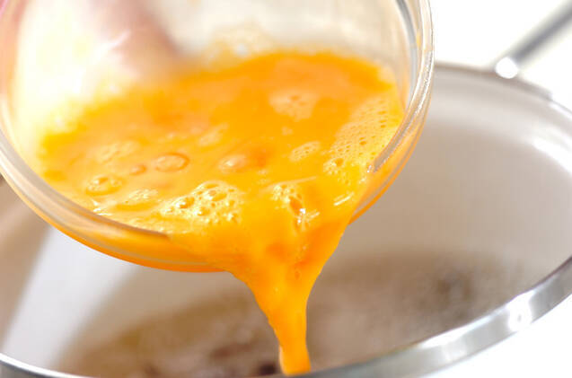 <水溶き片栗>を加え、トロミがついたら卵を回し入れる。ふんわりしたら器に注ぎ、ショウガと刻みネギを入れる。