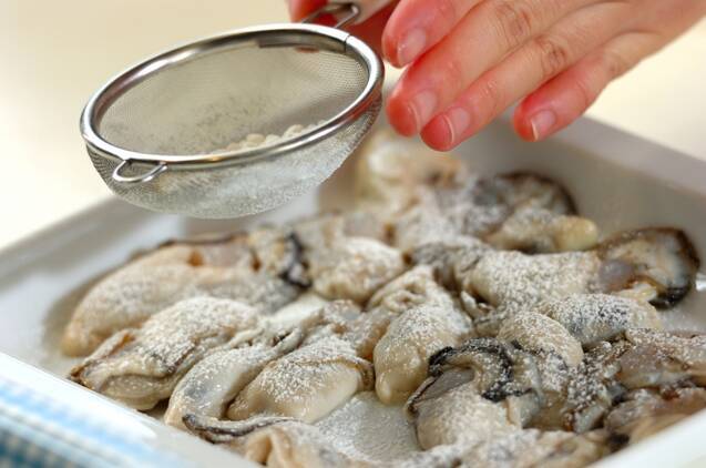 生カキは水でサッと洗って汚れを落とし、キッチンペーパーで水気を拭き、小麦粉を振る。