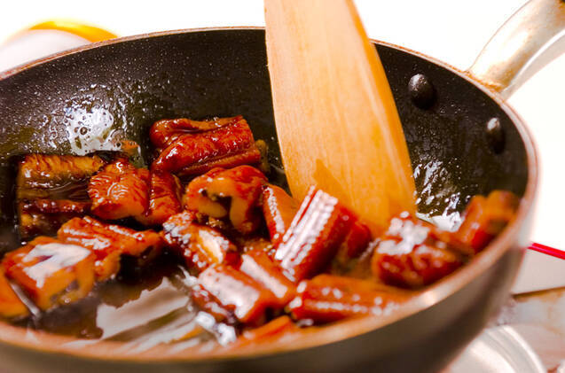 フライパンに<タレ>を入れて弱火にかけ、煮立つ直前に昆布を取り出し、トロミがついてきたら火を止めて、アナゴを加えてからめる。