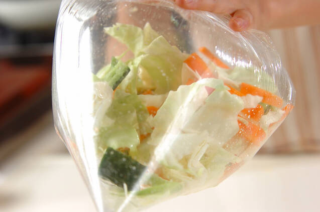 抗菌のビニール袋に、キャベツ、キュウリ、ニンジンを入れて塩を加え、塩を全体にからませる。ビニール袋の空気をしっかり抜いて口をしばって15分置き、キャベツがしんなりしたら水気を絞る。
