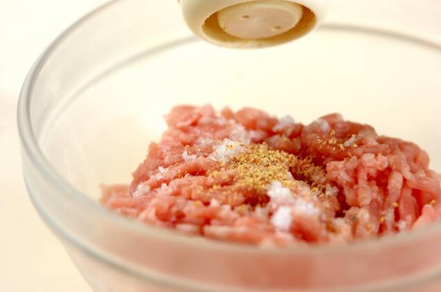 鶏ひき肉にしっかり塩コショウする。玉ネギは、みじん切りにする。