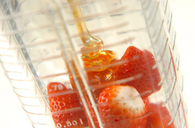 ミキサーにイチゴ、ハチミツを入れてピューレ状になるまでかくはんする。