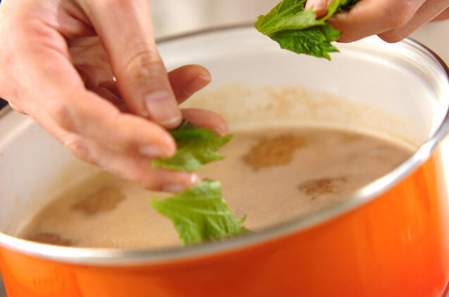 再び煮たったら、みそ、練り白ゴマを溶き入れ、大葉をちぎりながら加えてひと混ぜし、器によそう。