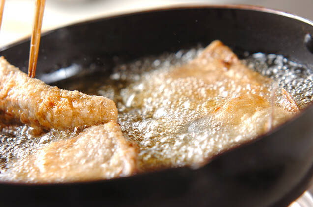 サバの汁気を切って片栗粉を絡め、揚げ油で揚げ、油を切って器に入れる。