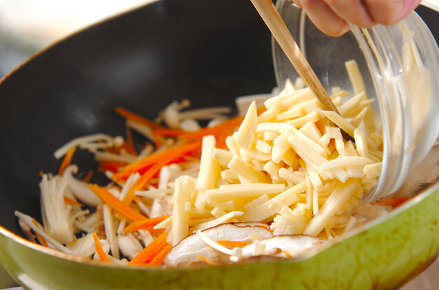 フライパンに分量外のサラダ油を入れてニンジン、エノキ、シイタケ、水煮タケノコを炒め合わせ、だし汁を加えて煮立ったら<調味料>を加える。