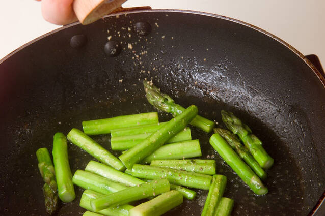 フライパンにバターを中火で熱し、グリーンアスパラを炒め、少し焼き色がつけば塩、コショウをして火を止める。