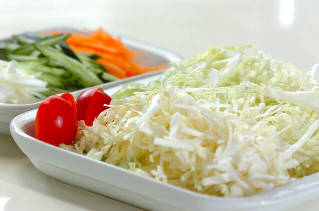 キャベツは長さ4cmのせん切りにする。