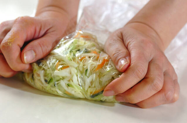 ビニール袋に、キャベツ、ニンジン、キュウリ、玉ネギ、塩を入れ、全体にしんなりするまでよくもむ。
