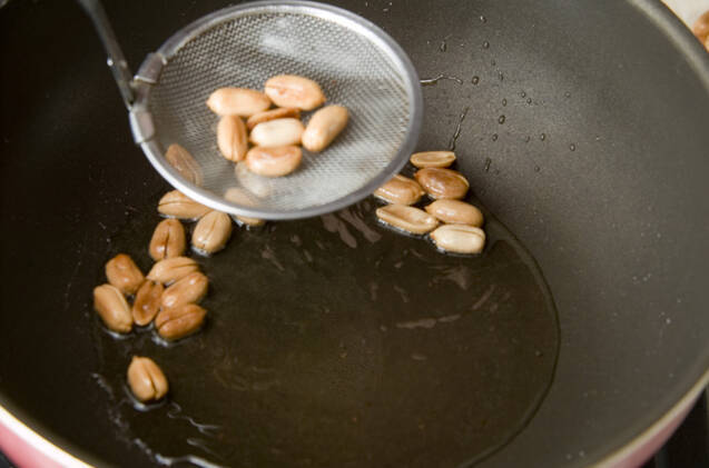 中華鍋にサラダ油大5を入れて中火にかけ、手をかざして温かくなってくれば、ピーナッツを加え薄いキツネ色になればいったん取り出す。鶏肉を加え、キツネ色の揚げ焼きにして取り出し、油を拭き取る。