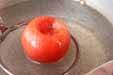 トマトはヘタをくり抜き、熱湯に入れる。皮が破れれば、すぐに冷水に放ち、皮をむき、水気を拭き取って一口大に切る。
